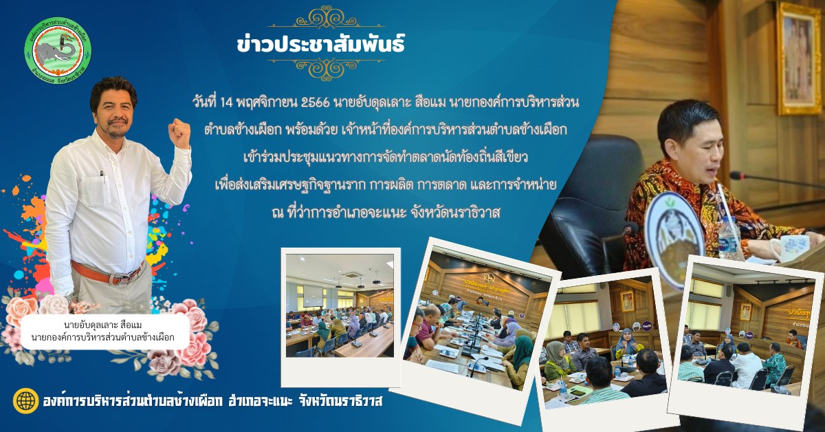 วันที่ 14 พฤศจิกายน 2566 นายอับดุลเลาะ สือแม นายกองค์การบริหารส่วนตำบลช้างเผือก พร้อมด้วย เจ้าหน้าที่องค์การบริหารส่วนตำบลช้างเผือก เข้าร่วมประชุมแนวทางการจัดทำตลาดนัดท้องถิ่นสีเขียว เพื่อส่งเสริมเศรษฐกิจฐานราก การผลิต การตลาด และการจำหน่าย ณ ที่ว่าการอำเภอจะแนะ จังหวัดนราธิวาส