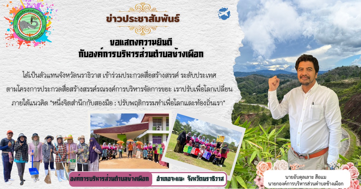 ขอแสดงความยินดีกับองค์การบริหารส่วนตำบลช้างเผือก ได้เป็นตัวแทนจังหวัดนราธิวาส เข้าร่วมประกวดสื่อสร้างสรรค์ ระดับประเทศตามโครงการประกวดสื่อสร้างสรรค์รณรงค์การบริหารจัดการขยะ เราปรับเพื่อโลกเปลี่ยน ภายใต้แนวคิด "หนึ่งจิตสำนึกกับสองมือ : ปรับพฤติกรรมทำเพื่อโลกและท้องถิ่นเรา"