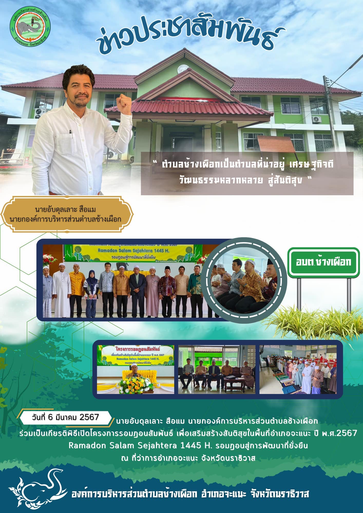 วันที่ 6 มีนาคม 2567 นายอับดุลเลาะ สือแม นายกองค์การบริหารส่วนตำบลช้างเผือก ร่วมโครงการรอมฎอนสัมพันธ์ เพื่อเสริมสร้างสันติสุขในพื้นที่อำเภอจะแนะ ประจำปี 2567/1445 ฮ. ณ หอประชุมที่ว่าการอำเภอจะแนะ จ.นราธิวาส