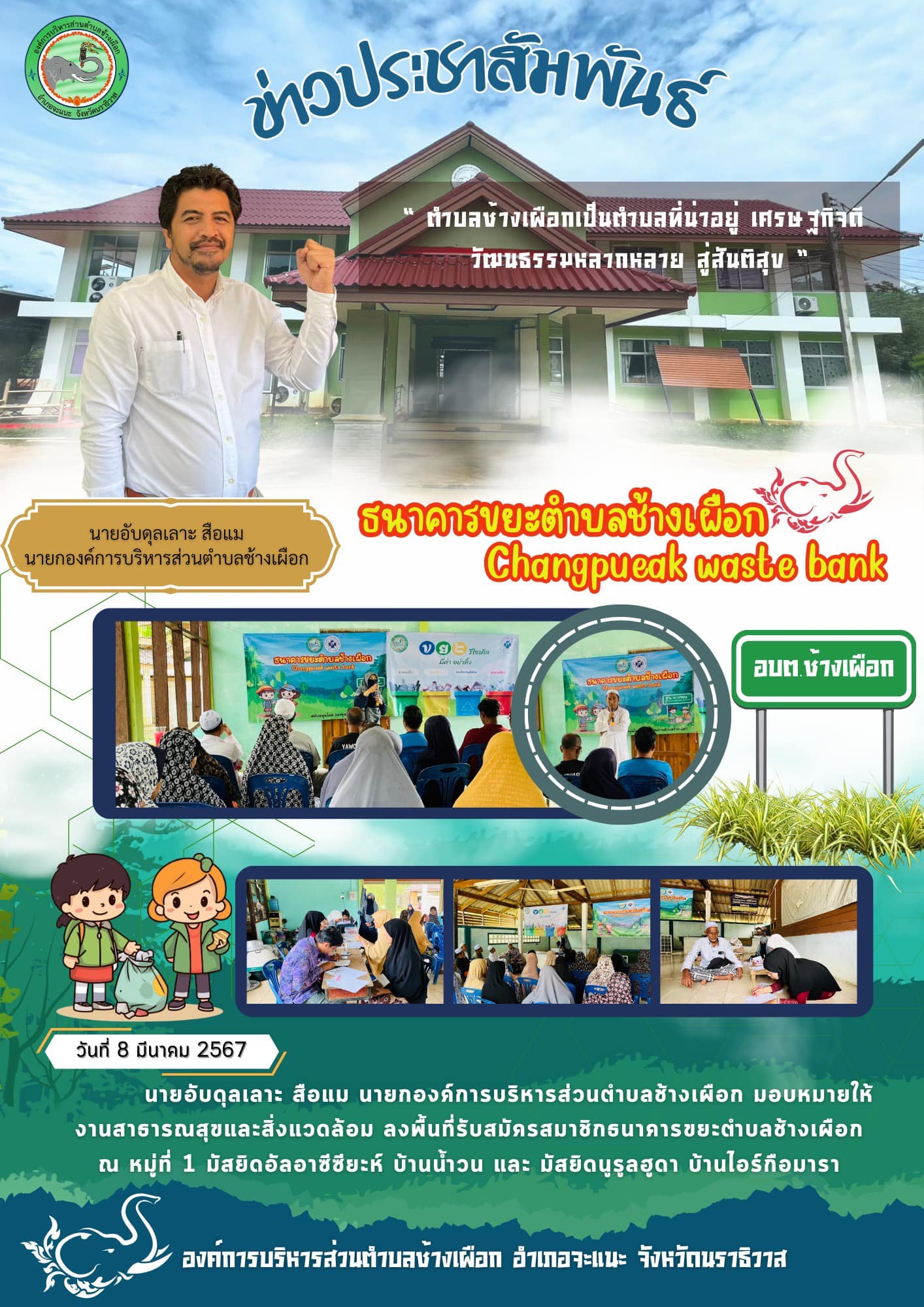 วันที่ 8 มีนาคม 2567 นายอับดุลเลาะ สือแม นายกองค์การบริหารส่วนตำบลช้างเผือก มอบหมายให้ งานสาธารณสุขและสิ่งแวดล้อม องค์การบริหารส่วนตำบลช้างเผือก ลงพื้นที่รับสมัครสมาชิกธนาคารขยะ ณ หมู่ที่ 1 มัสยิดอัลอาซีซียะห์ บ้านน้ำวน และ มัสยิดนูรูลฮูดา บ้านไอร์กือมารา