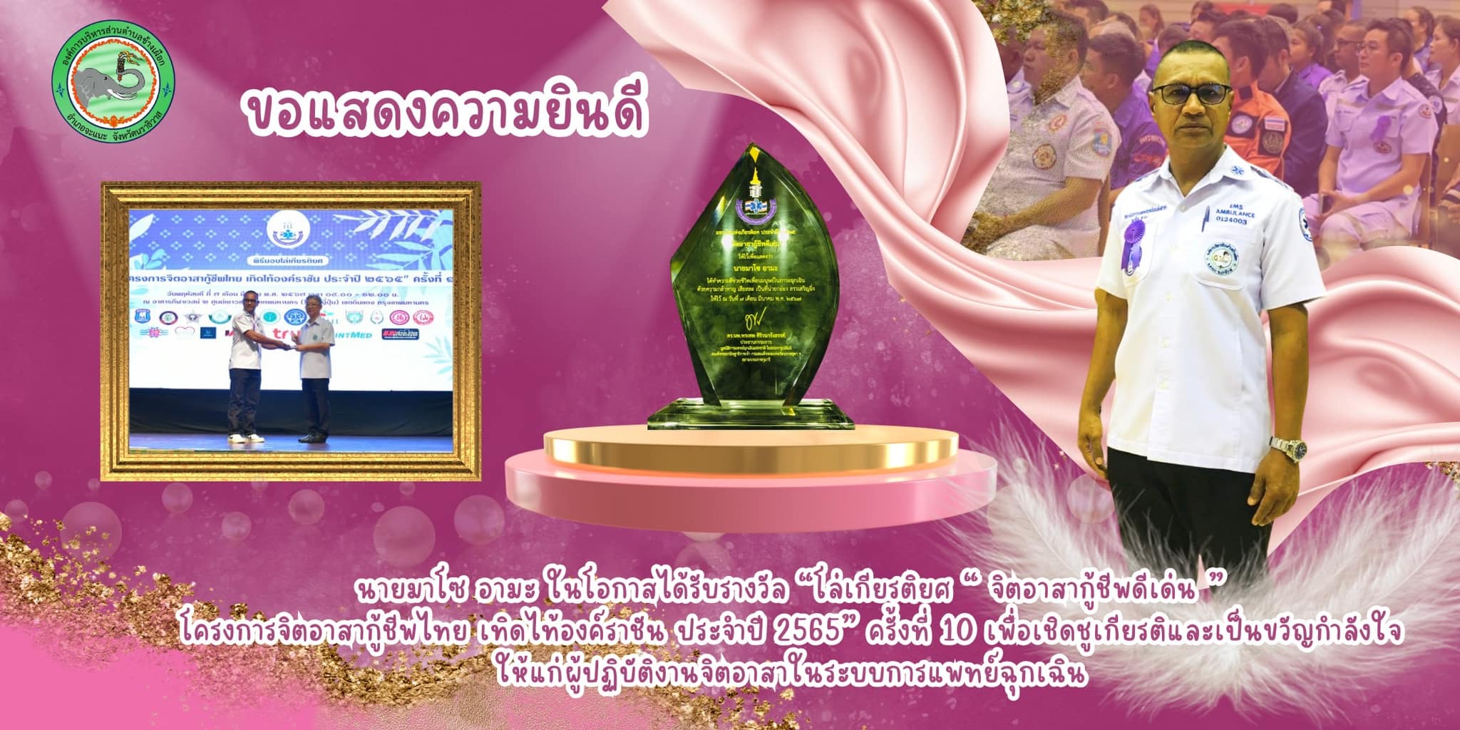 ขอแสดงความยินดีกับ นายมาโซ อามะ ในโอกาสได้รับรางวัล โล่เกียรติยศ “ จิตอาสากู้ชีพดีเด่น ” โครงการจิตอาสากู้ชีพไทย เทิดไท้องค์ราชัน ประจำปี 2565 ครั้งที่ 10 เพื่อเชิดชูเกียรติและเป็นขวัญกำลังใจให้แก่ผู้ปฏิบัติงานจิตอาสาในระบบการแพทย์ฉุกเฉิน