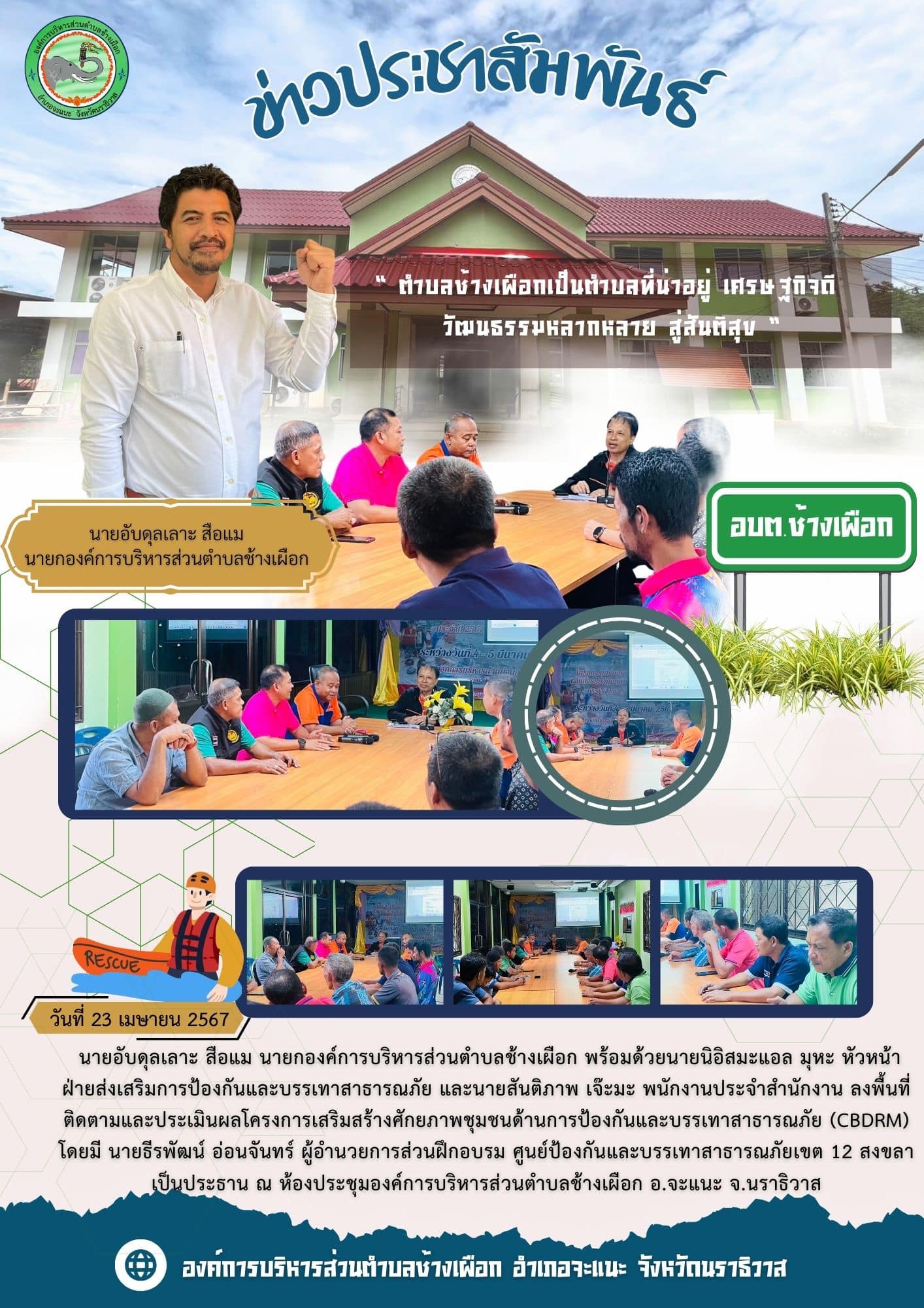 วันที่ 23 เมษายน 2567 นายอับดุลเลาะ สือแม นายกองค์การบริหารส่วนตำบลช้างเผือก พร้อมด้วยนายนิอิสมะแอล มุหะ หัวหน้าฝ่ายส่งเสริมการป้องกันและบรรเทาสาธารณภัย และนายสันติภาพ เจ๊ะมะ พนักงานประจำสำนักงาน ลงพื้นที่ติดตามและประเมินผลโครงการเสริมสร้างศักยภาพชุมชนด้านการป้องกันและบรรเทาสาธารณภัย (CBDRM) โดยมี นายธีรพัฒน์ อ่อนจันทร์ ผู้อำนวยการส่วนฝึกอบรม ศูนย์ป้องกันและบรรเทาสาธารณภัยเขต 12 สงขลา เป็นประธาน ณ ห้องประชุมองค์การบริหารส่วนตำบลช้างเผือก อ.จะแนะ จ.นราธิวาส