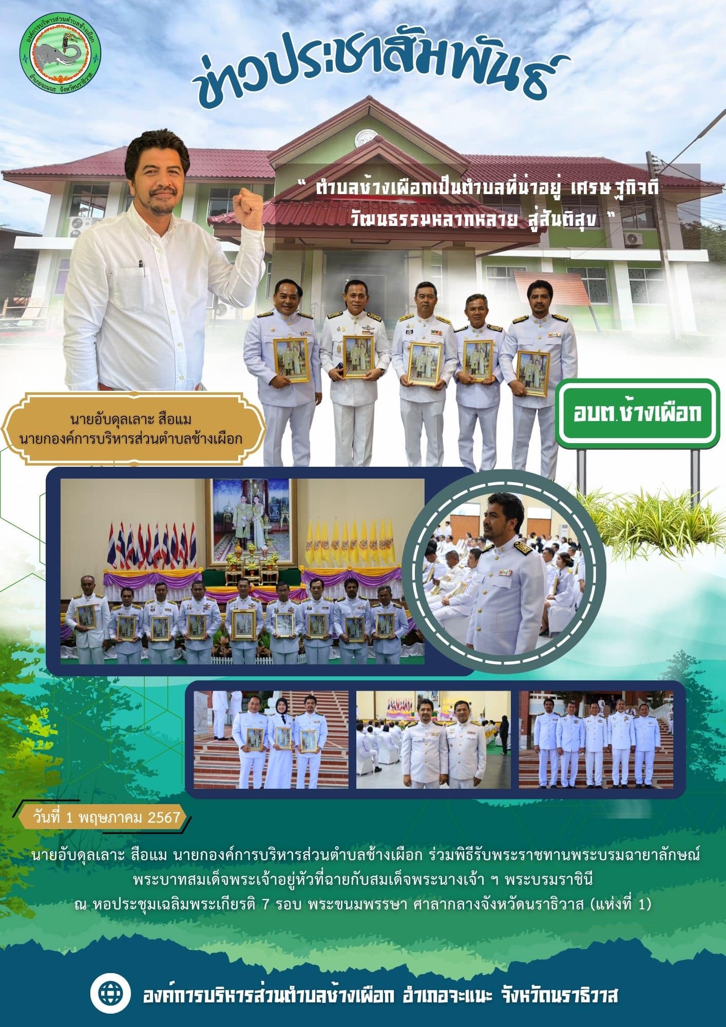 วันที่ 1 พฤษภาคม 2567 นายอับดุลเลาะ สือแม นายกองค์การบริหารส่วนตำบลช้างเผือก ร่วมพิธีรับพระราชทานพระบรมฉายาลักษณ์ พระบาทสมเด็จพระเจ้าอยู่หัวที่ฉายกับสมเด็จพระนางเจ้า ฯ พระบรมราชินี ณ หอประชุมเฉลิมพระเกียรติ 7 รอบ พระขนมพรรษา ศาลากลางจังหวัดนราธิวาส (แห่งที่ 1)