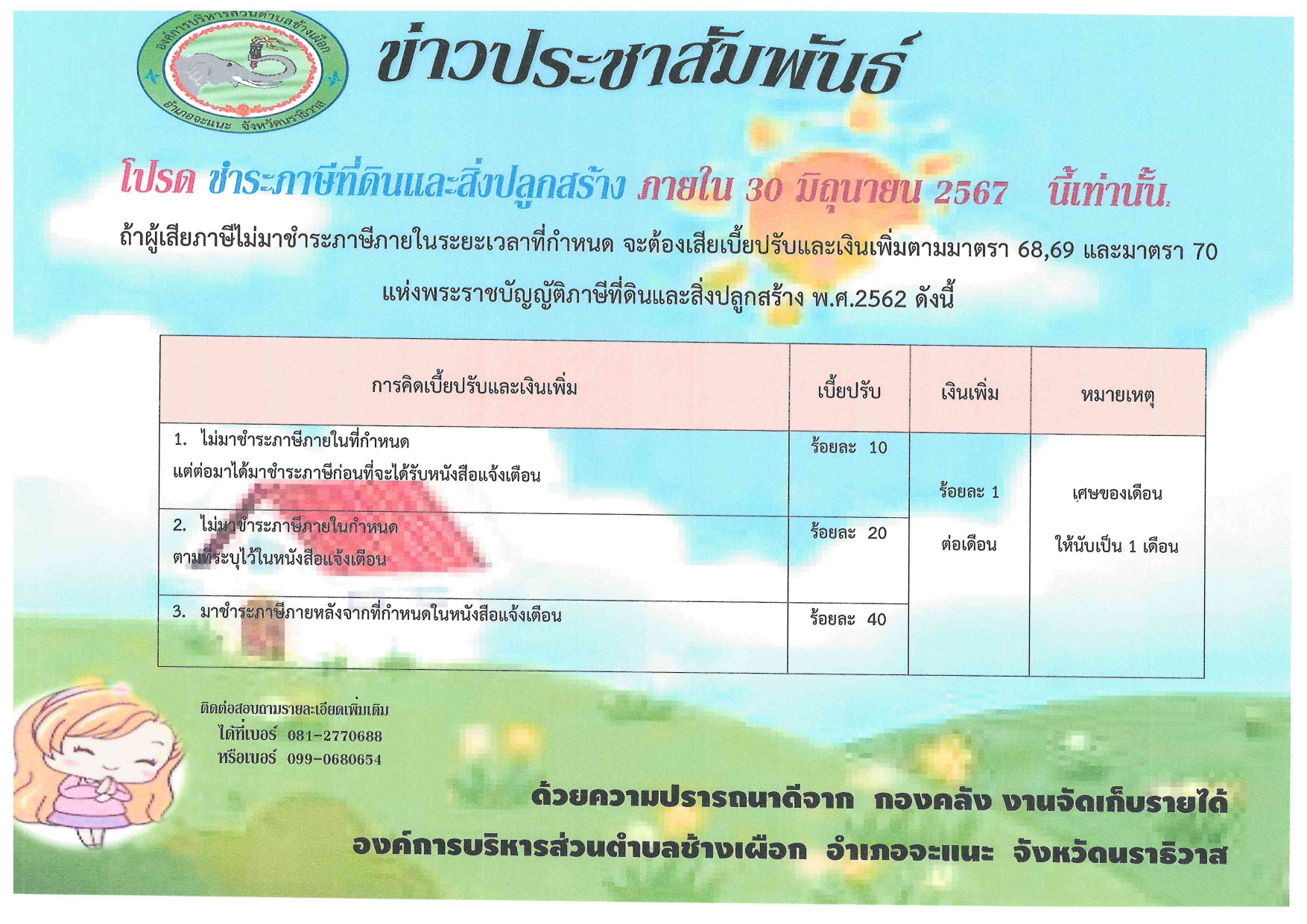 โปรด มาชำระภาษ๊ที่ดินแลสิ่งปลูกสร้าง ภายใน 30มิถุนายน 2567 นี้เท่านั้น  ถ้าผู้เสียภาษีไม่มาชำระภาษีภายในระยะเวลาที่กำหนด จะต้องเสียเบี้ยปรับแลเงินเพิ่มตามมาตรา 68,69 และมาตรา 40 แห่งพระราชบัญญัติภาษีที่ดินและสิ่งปลูกสร้าง พ.ศ.2562