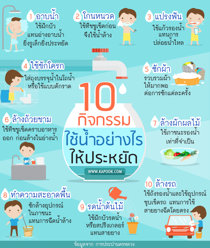 1. อาบน้ำ : ฝักบัวสิ้นเปลืองน้ำน้อยสุด ใช้น้ำเพียง 30 ลิตร ควรปิดฝักบัวขณะถูสบู่